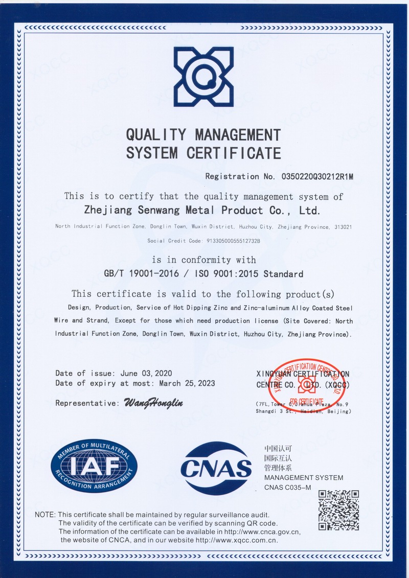 浙江森旺金屬制品有限公司成立于2012年,坐落湖州市吳興區(qū)東林鎮(zhèn)工業(yè)功能區(qū)。公司專業(yè)從事各類鍍鋅鋼絲、鋼絞線等產(chǎn)品的開發(fā)及生產(chǎn)。目前產(chǎn)品已廣泛應(yīng)用于各類通信光電纜,電力輸送,電氣化鐵路工程,各類堤壩防護及農(nóng)業(yè)溫室等工程領(lǐng)域。公司秉承“追求卓越品質(zhì),創(chuàng)建卓著信譽”的經(jīng)營理念,始終堅持專業(yè)化、規(guī)模化的經(jīng)營模式。